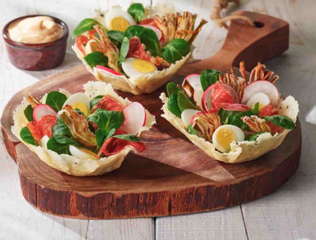 Iniziate preparando i cestini, sembrano difficili ma con le mie istruzioni sarà un gioco da ragazzi: mettete un disco di carta forno nella padellina antiaderente, versate in tondo 25/30 g di formaggio, compattatelo a cerchio e mettete sul fuoco medio/basso; se vi piace potete insaporirlo con una spolverata di pepe nero macinato. Lasciate fondere, senza toccare, fino a che non comincia a fare delle bollicine e i bordi non diventano dorati. Con l’aiuto di una paletta sollevate la carta, staccate il formaggio e mentre è ancora morbido, appoggiatelo su una tazza capovolta. Modellatelo leggermente con le dita e aspettate che si raffreddi e diventi croccante: basteranno un paio di minuti.