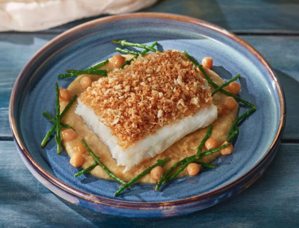 Appena cotto sfornate e servite i pezzi di baccalà sul piatto posizionandolo sulla crema di ceci, contornato da ceci interi, rametti di salicornia e un ultimo giro d’olio a crudo e pepe.
