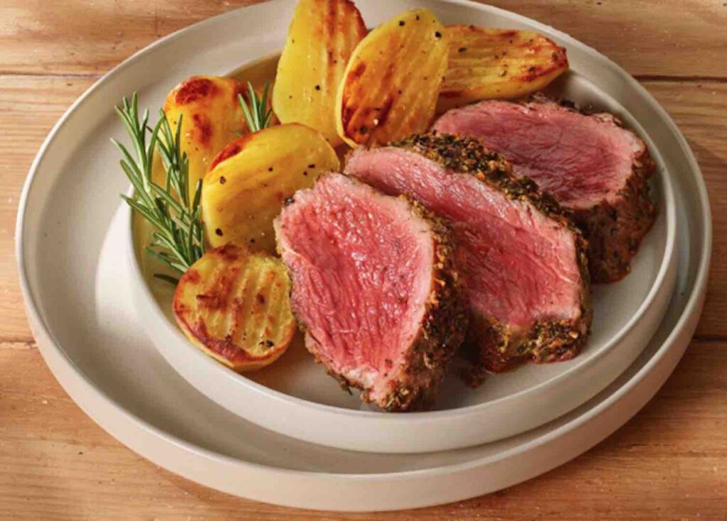 Sistemate la carne in una teglia capiente (occhio che più tardi ci andranno anche le patate!), infilate in forno aggiungendo un po’ di olio. Cuocete la carne per 20 minuti, sfumate con del vino, abbassate il forno a 180° e inserite le patate, oliandole un po’. Rigirate la carne ogni tanto e bagnatela con la sugaglia creata nella teglia, rigirando con attenzione anche le patate. Quando il termometro inserito a metà pezzo segna 55° è il momento di levare la teglia dal forno, per chi preferisce la carne al sangue.