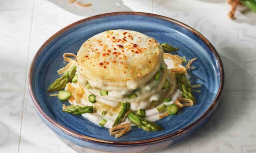 Il primo: lasagnetta con asparagi, porri e crema di ricotta
