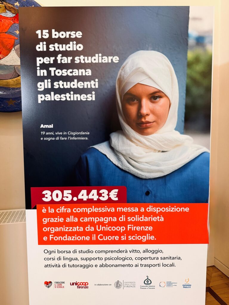 Un risultato straordinario: 305.443 euro, raccolti in un mese, grazie alla campagna per il sostegno allo studio di 15 giovani palestinesi provenienti da Gaza e Cisgiordania, promossa da Unicoop Firenze e Fondazione Il Cuore si scioglie, in collaborazione con l’Università di Firenze, la Comunità Islamica di Firenze e Toscana, il Centro Internazionale Studenti Giorgio La Pira e la Fondazione Giovanni Paolo II.
