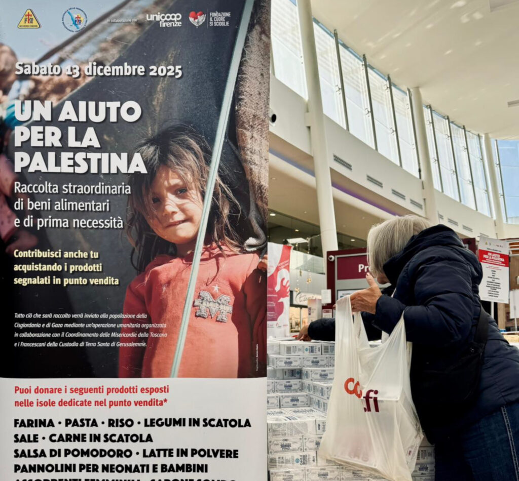Sabato 13 dicembre una raccolta alimentare straordinaria per Gaza e la Cisgiordania, organizzata in 9 punti vendita della cooperativa, uno per ogni provincia in cui è presente Unicoop Firenze, in collaborazione con la Federazione delle Misericordie della Toscana e le associazioni di volontariato attive sul territorio.